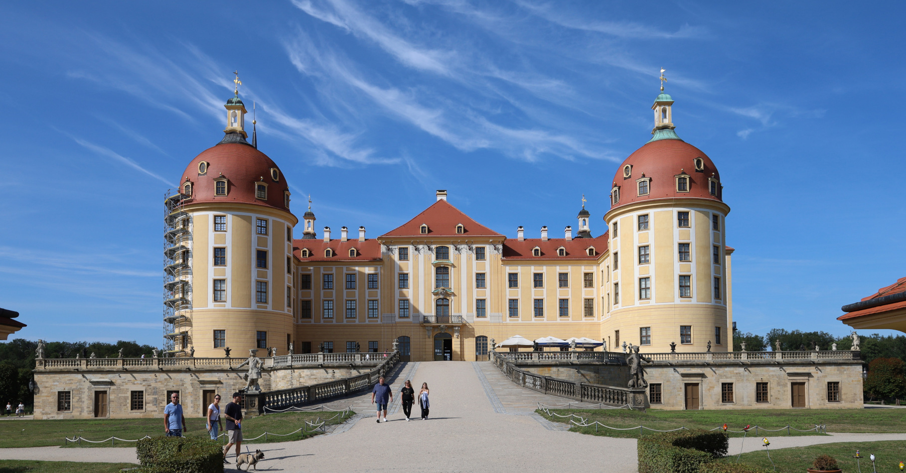 Każda z ogromnych czterech wież zamku ma swoją nazwę związaną z jej pierwotnym przeznaczeniem: kuchenna, piekarnicza, biurowa i myśliwska. Widok zamku od strony parku jest identyczny jak ten od strony miejscowości Moritzburg.
