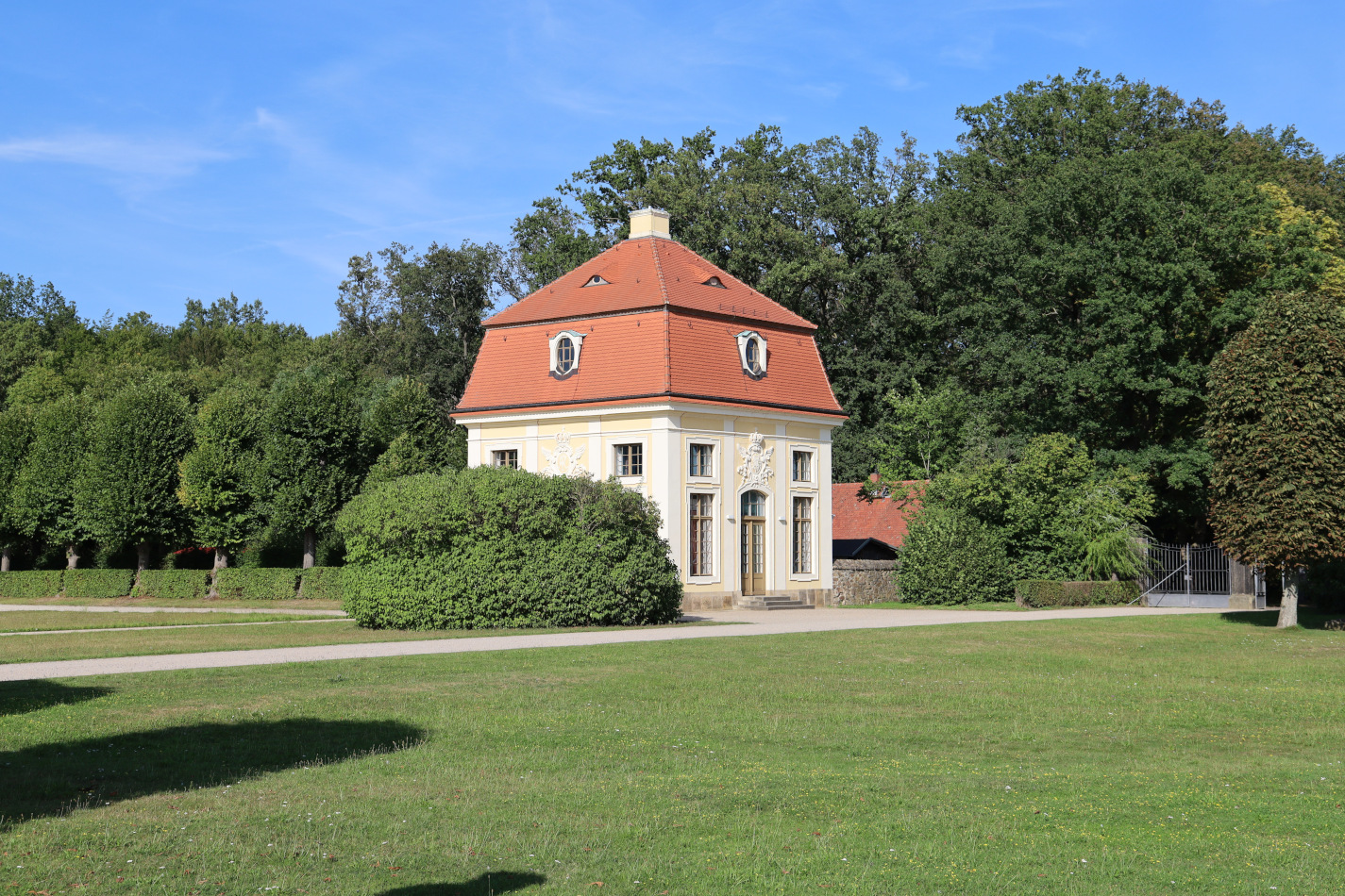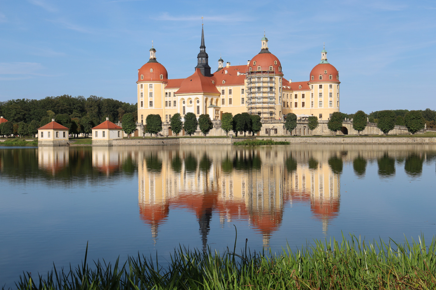 Pięknie położony, na niewielkim wzgórzu i otoczony wodą zamek był zimową rezydencją myśliwską elektorów i królów Saksonii. Pierwotne założenia budowli sięgają połowy XVI wieku ale koniec jej budowy przypada na rok 1730 za czasów panowania króla Augusta II Mocnego, który wymógł na swoim architekcie, Matthäusie Pöppelmannie, aby stworzył tu barokowy zamek myśliwski z wieloma tarasami, rampami i mostami.